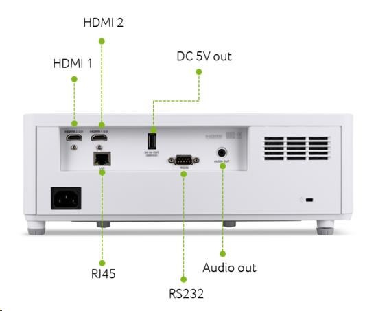 Skutečné rozlišení projektoru:4K UHD (3840x2160); Technologie:DLP; Svítivost (v ANSI lumenech):5500; Rozhraní:LAN (RJ-45), HDMI, 3.5mm Jack, RS-232; Umístění:Na strop; Funkce:Reproduktory, Zoom.