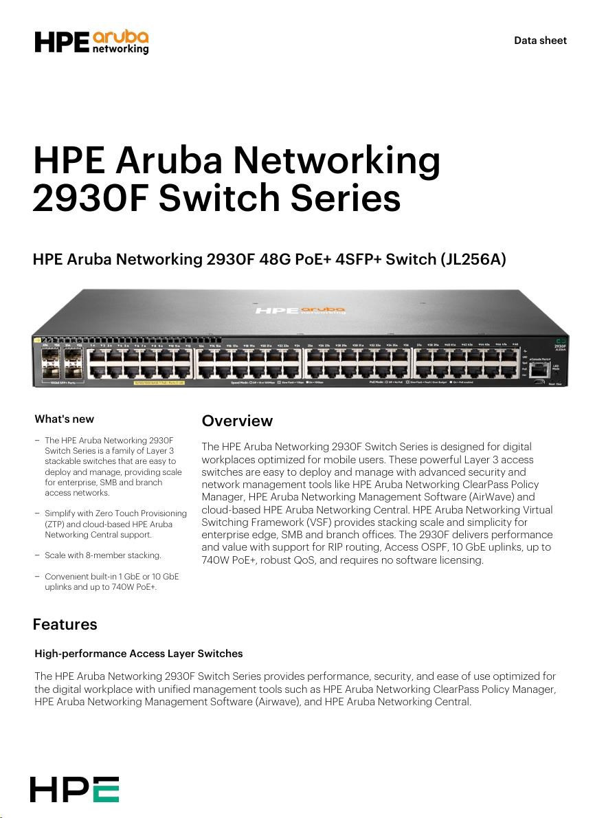 Aruba 2930F 48G PoE+ 4SFP+ Swch RENEW JL256A.