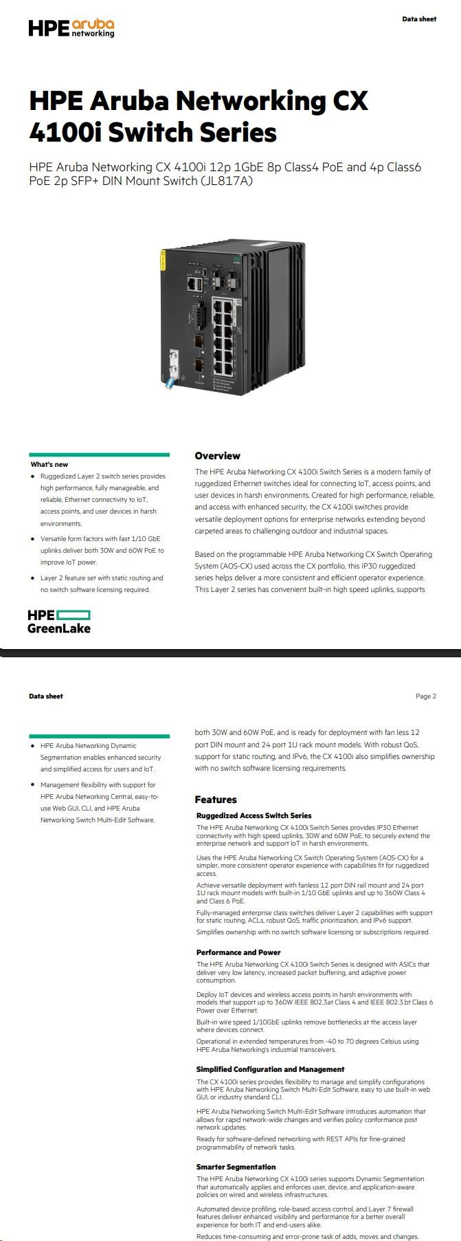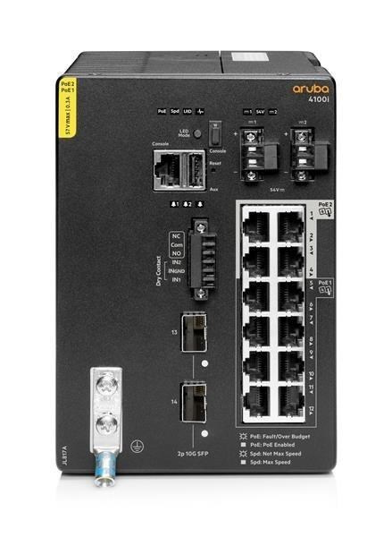 Aruba 4100i 12-port 1GbE (8-port Class 4 POE and 4-port Class 6 POE) 2-port SFP+ DIN Mount Switch JL817A RENEW