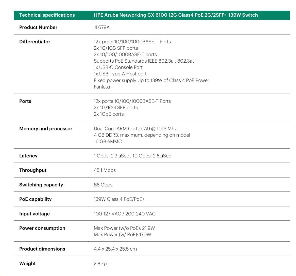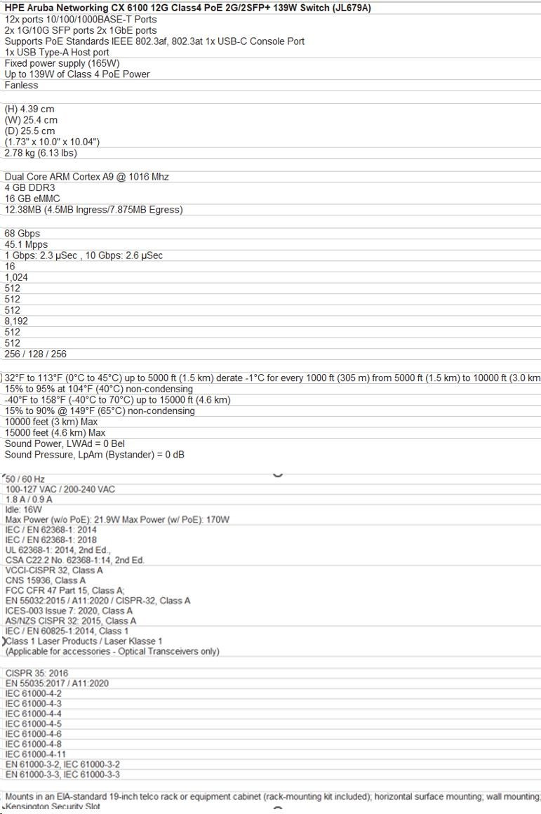 Aruba 6100 12G Class4 PoE 2G/2SFP+ 139W Switch JL679A RENEW.