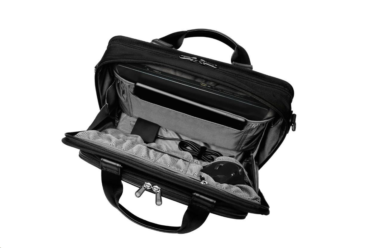 Tašku ASUS Vantage Briefcase je možné nosit za rukojeť, nebo si ji přehodit za rameno pomocí popruhu. Je vybavená také popruhem pro připevnění k zavazadlům.
