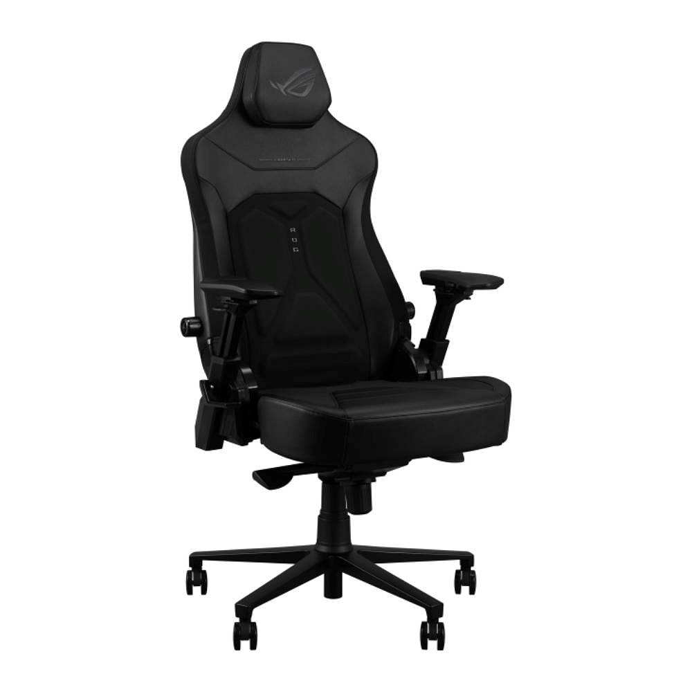 Herní židle ROG Courser Core s nastavitelnou bederní opěrkou z pěny tvarované za studena pro lepší oporu a proudění vzduchu, 4D područkami, ultraširokým sedákem, magnetickým podhlavníkem a dynamickým systémem synchronizovaného naklápění.