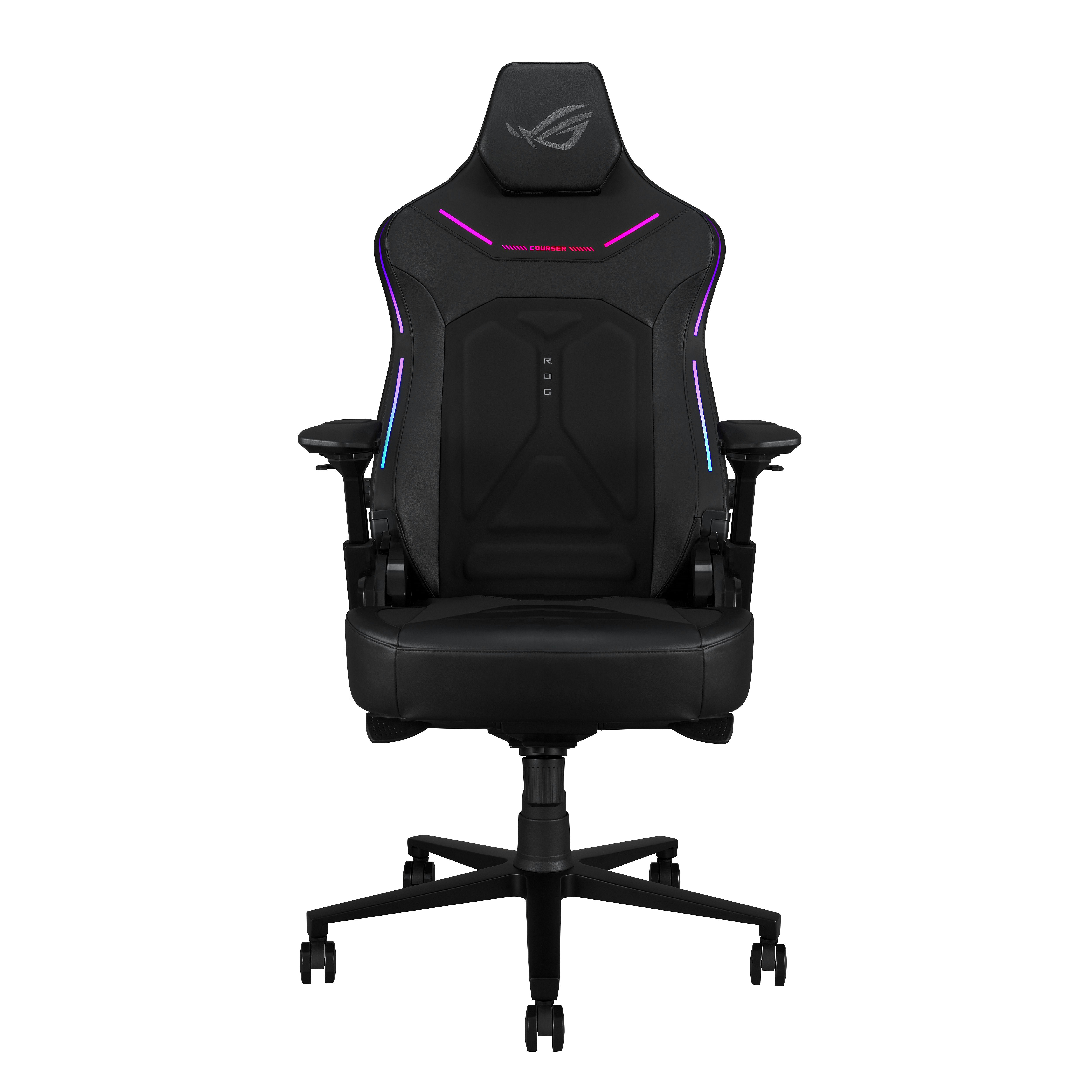 Herní židle ROG Courser s nastavitelnou bederní opěrkou lisovanou za studena pro podporu a proudění vzduchu, 4D područkami, ultraširokým sedákem, magnetickou opěrkou hlavy, dynamickým synchronizovaným systémem sklápění a osvětlením Aura RGB
