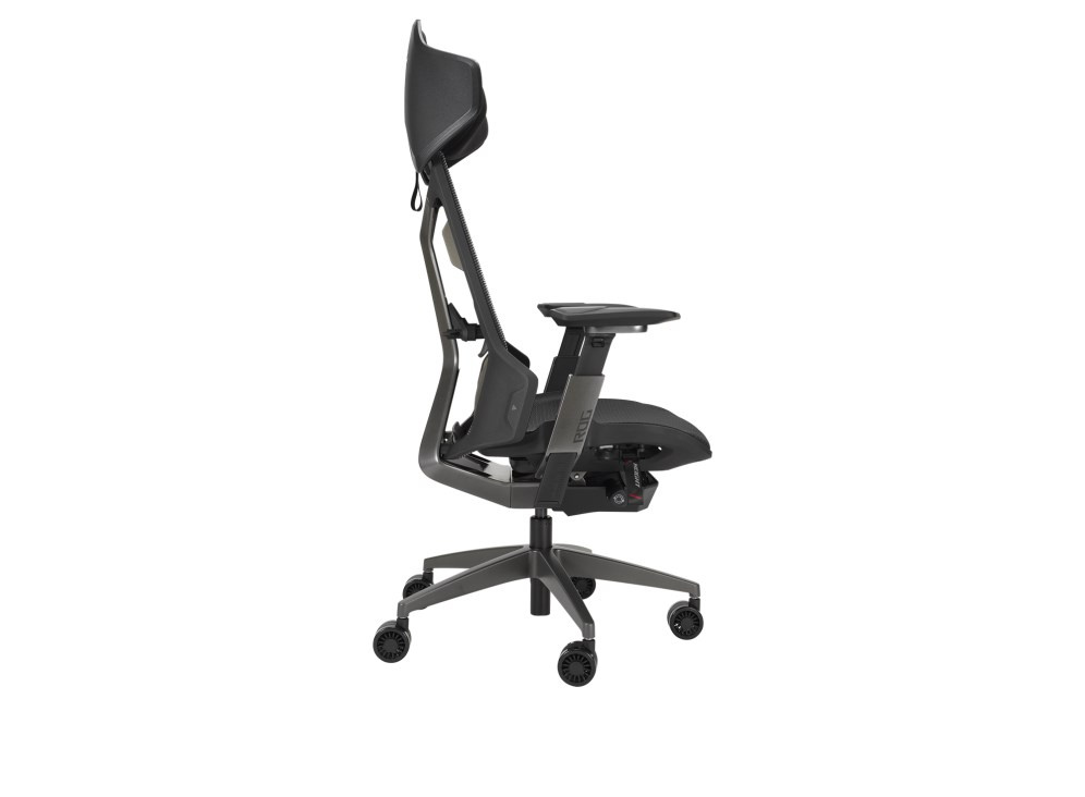 ROG Destrier Ergo Gaming Chair with futuristic cyborg aesthetic, versatile seat adjustments for the perfect posture, mobile gaming arm support mode, and acoustic panel for less distraction and more immersive gaming experience.
