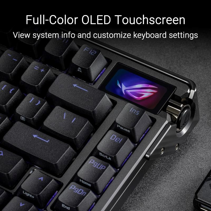 ROG Azoth Extreme je přizpůsobitelná 75% herní klávesnice s prémiovým šasi z hliníkové slitiny a kovovým rámem. Vyznačuje se rychlostí hlášení 8000 Hz s ROG Polling Rate Booster a více než 1600 hodin výdrže baterie v bezdrátovém režimu ROG SpeedNova 2,4 GHz. Vylepšený OLED dotykový displej a třícestný knoflík umožňují monitorování systému a rychlé nastavení. Polohovací deska z uhlíkových vláken zajišťuje ostrý zvuk při psaní, zatímco tři tlumicí vrstvy absorbují vibrace. Nastavitelný držák těsnění s pádlovým spínačem nabízí dvě možnosti psaní.