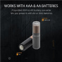 - Works with an AA or AAA batteries via the bundled battery converter holder for a 10% weight reduction