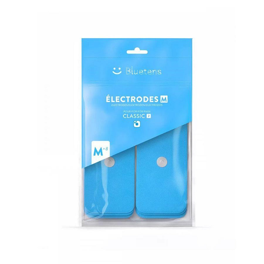 Elektrody můžete použít opakovaně, přibližně 20x – 30x. Jejich životnost podpoříte přikládáním na suchou a čistou pokožku a vhodným skladováním. Uchovávejte nejlépe v původním uzavíratelném obalu, který zabrání vysychání vodivého gelu. Elektrody a gel jsou vyrobeny z kvalitních nealergizujících materiálů a jsou uzpůsobené k lepší vodivosti a rozptylu proudu při elektroterapii. Velikost M je ideální pro ošetření větších oblastí bez ohledu na to, zda zvolíte program z kategorie Cure, Relax nebo Tone. Přesné umístění vám pro co nejefektivnější účinek doporučí aplikace Bluetens Get Better. Tyto elektrody jsou vybaveny magnetickým připevňovacím systémem, z tohoto důvodu jsou kompatibilní pouze s modelem elektrostimulátoru Bluetens Classic 2.