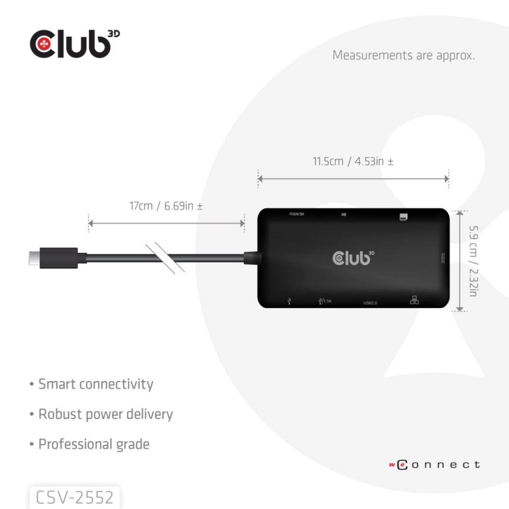 Club 3D CSV-2552 je rozbočovač USB-C® 9-1 s duálním HDMI™, 2x USB-A, 1x USB-C® data, RJ45, sloty pro karty Micro SD/SD a nabíjecím portem USB-C®, který představuje ideální řešení pro rozšíření portu USB-C® nebo Thunderbolt hostitele (PC/Laptop/Mobilní telefon atd.), zejména pro hostitele s jediným portem USB-C.