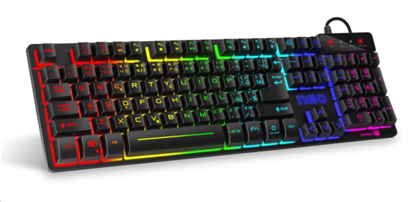 Profesionální gamingová klávesnice NEO series pro hráče počítačových her v českém a slovenském layoutu s celkem 9 módy barevného rainbow podsvícení a čtyřstupňovou regulací intenzity podsvícení. K dispozici je 12 multimediálních kláves.