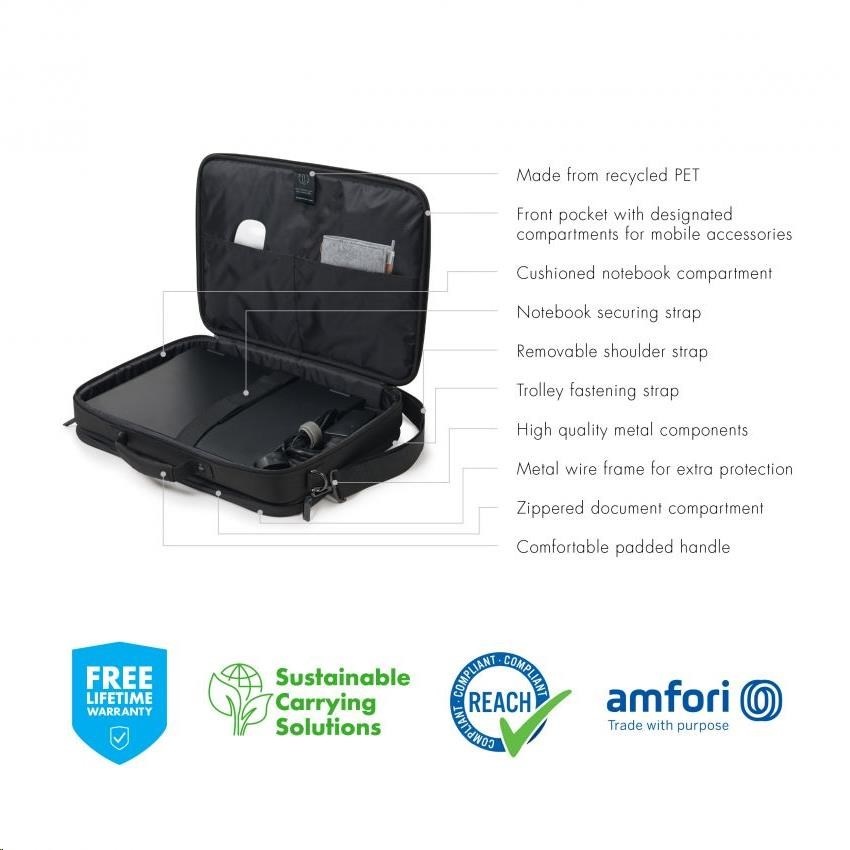 The compact Eco Multi Plus BASE Clamshell case with extra document storage offers ideal protection for your laptop thanks to its padded notebook compartment. The case fully protects devices between 15 and 17.3" and the elastic strap also secures them within their compartment. The Eco Multi Plus BASE guarantees extra stability and protection with its metal frame, as well as flexible mobility thanks to its lightweight design. You can store your documents in the dedicated front zipped compartment. Your smartphone or other smaller items like cables, pens or chargers can be stored in the convenient front pocket, so they are always to hand. The case's handles make it comfortable to carry and it can be attached to a suitcase in seconds with its built-in strap. It can also be carried using its adjustable shoulder strap. The Eco Multi Plus BASE is therefore perfect for you if you are always on the go and want to support the recycling of PET bottles with an eco-friendly case.