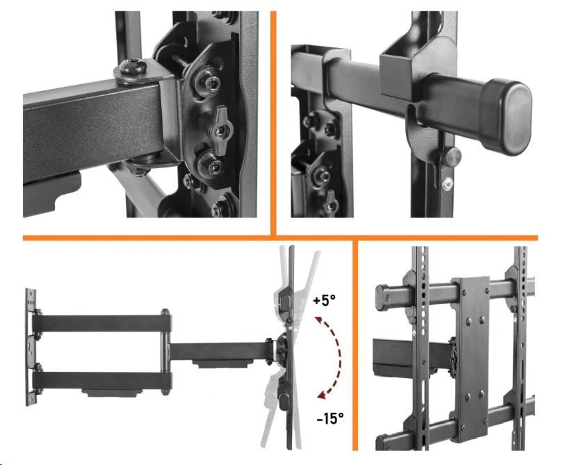 Otočný sklopný výsuvný držák Tv Fiber Mounts RAPTOR Kvalitní držák Tv 43" - 60", vzdálenost od zdi 62 - 615mm, otočný až +90° / -90°, naklápění +5° / -15°, kvalitní pevná konstrukce, úchytky na kabeláž, instalační materiál, VESA 200x100 až 400x400, nosnost 50kg, záruka 10 let Kvalitní nástěnný držák na televize Fiber Mounts RAPTOR Představujeme Fiber Mounts RAPTOR - kvalitní držák pro televizi, který promění váš obývací pokoj v dynamické multimediální centrum. S Fiber Mounts RAPTOR se každý filmový večer stane nezapomenutelným zážitkem, a každý sportovní přenos tak živým, jako byste byli přímo na stadionu. Nenechte se svazovat statickým umístěním vaší televize. Díky otočnému mechanismu +90° / -90° a naklápění +5° / -15° si můžete obrazovku nastavit přesně podle vašich potřeb. Ať už chcete sledovat oblíbený film z pohodlí gauče, křesla nebo potřebujete upravit úhel pohledu pro videohovor, Fiber Mounts RAPTOR vám to umožní s lehkostí. Navíc, s vzdáleností od zdi 62 - 615mm poskytuje Fiber Mounts RAPTOR nejen flexibilitu v umístění, ale také jednoduchý přístup k zadním portům vaší televize pro rychlé připojení nebo odpojení zařízení. A díky pevné konstrukci a nosnosti až 50kg můžete mít jistotu, že váš 43" - 60" televizor bude v bezpečí. Nezapomněli jsme ani na estetickou stránku. S úchytkami na kabeláž bude váš obývací pokoj vždy vypadat uklizeně a organizovaně, bez rušivých kabelů visících z televize. A s přiloženým instalačním materiálem a zárukou 10 let je montáž a používání Fiber Mounts RAPTOR hračka. Televizní držák kvalitní robustní konstrukce Fiber Mounts RAPTOR Technické údaje: nosnost 50kg podpora VESA standardů pro zavěšení Tv 200x100 až 600x400 ideální na televize a obrazovky s úhlopříčkou 43" až 60" nastavitelná vzdálenost od zdi 62 - 615mm otáčení obrazovky do stran až +90° / -90° naklápění +5° / -15° korekce roviny obrazovky +3° / -3° kvalitní velmi pevná konstrukce úchytky na kabeláž nástěnný úchyt o rozměrech 275 x 90mm barevné provedení černé záruka 10 let.