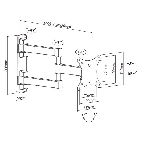 Držák na Tv a monitory Fiber Mounts FM234 Kvalitní nástěnný držák pro zavěšení televizorů a monitorů 13-32", nastavení vzdálenosti od zdi 44-320mm, otočný +/- 90°, sklopný +3° / -10°, korekce roviny +/- 3°, nástěnná krytka, snadné zavěšení Tv, VESA standardy 75x75 a 100x100, nosnost 20kg Kvalitní a pěkný polohovatelný držák na televize a monitory s úhlopříčkou 13-32" (dle hmotnosti a VESA i větší). Držák má velmi snadnou instalaci televize díky demontovatelné VESA destičce - ta se samostatně namontuje na televizi a následně celou Tv přes VESA destičku upnete do držáku a zajistíte šroubem. Velkým pomocníkem je i korekce roviny obrazovky +/- 3°. Televizory nebo monitory můžete po uchycení na držák otáčet do stran až o +/- 90° (dle šířky Tv), naklápět od +3° až do -10°. Držák podporuje VESA standardy 75x75 a 100x100 a má nosnost 20kg. V balení naleznete krytku nástěnného úchytu a instalační materiál. Barevné provedení je černé. Prodloužená záruka na 5 let. Kvalitní nástěnný držák na televize a monitory Fiber Mounts FM234 Technické údaje: nosnost 20kg podporuje VESA standardy 75x75 a 100x100 ideální na televize a monitory s úhlopříčkou 13" až 32" nastavitelná vzdálenost Tv od zdi 44-320mm otáčení na obě strany až +/- 90° (v závislosti na šířce Tv) naklápění nahoru až +3° a dolů až -10° korekce roviny obrazovky +/- 3° krytka nástěnného úchytu pro zakrytí kotvících šroubů kvalitní ocelová konstrukce snadné uchycení televize nebo monitoru na držák barevné provedení černé balení obsahuje instalační materiál prodloužená záruka na 5 let Velmi snadná instalace televize na držák díky možnosti odejmutí VESA destičky Fiber Mounts FM234 Nástěnný držák Tv monitoru Fiber Mounts FM234 podporuje VESA standardy: VESA 75x75 VESA 100x100 Na držáky Fiber Mounts FM234 je možné zavěsit veškeré televize, monitory a displeje, jejichž hmotnost není vyšší jak 20kg a které podporují některý z výše uvedených VESA standardů. Uváděná velikost / úhlopříčka televize není podstatná a neurčuje, zda je Tv na držák vhodná..