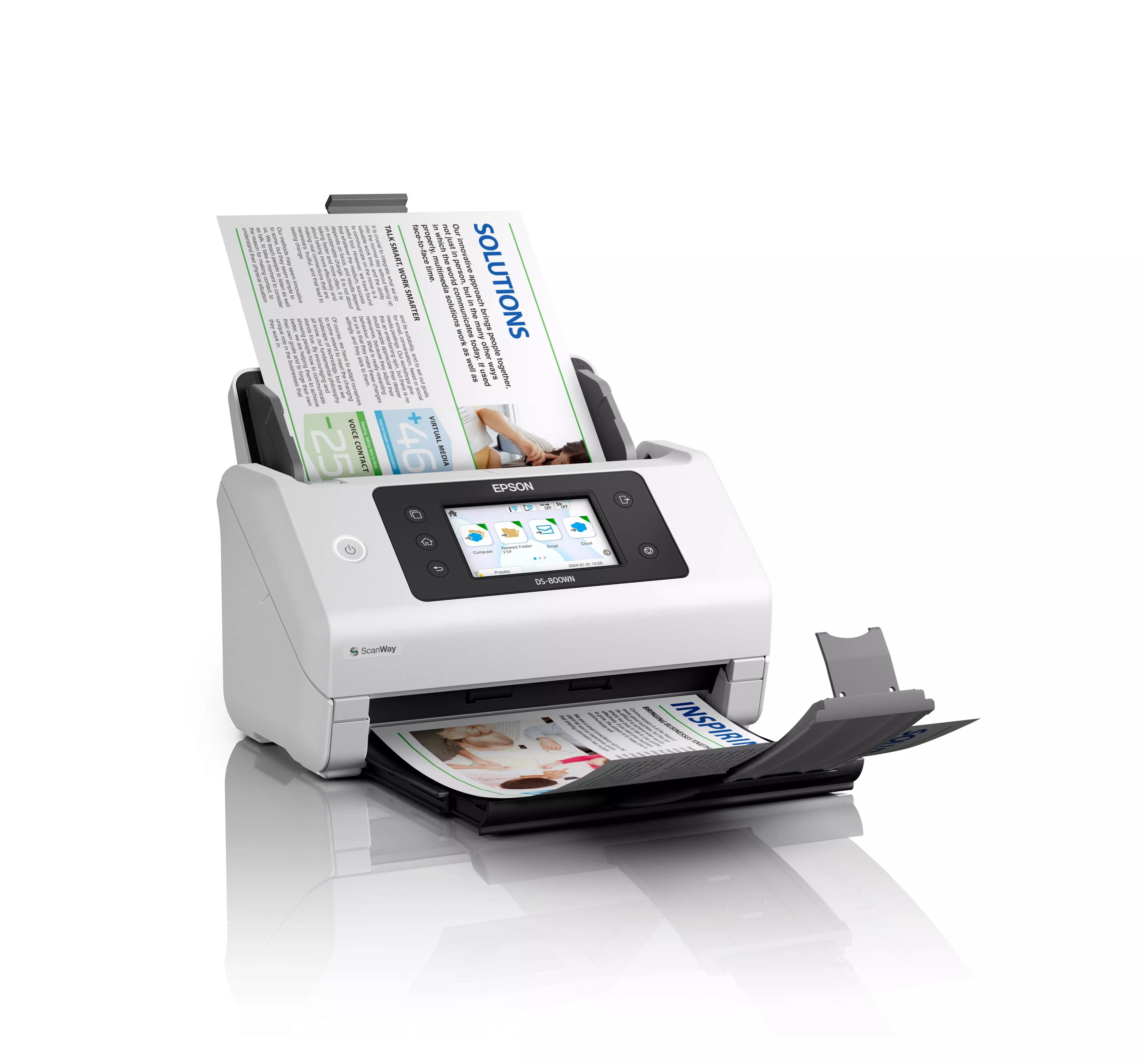 WorkForce DS-800WN je vysokorychlostní skener integrovaný do sítě a sítě Wi-Fi, který je kompatibilní s technologií Open Platform. Síťový business skener Open platform Vysoká rychlost: 50 str./min / 100 obr./min Tento business skener nabízí komplexní řešení pro efektivní, spolehlivé, bezpečné a uživatelsky přívětivé skenování dokumentů. Díky pokročilým funkcím, bezproblémové integraci (s řešeními třetích stran) a intuitivnímu rozhraní je DS-800WN ideální pro podniky všech velikostí. Je také vyroben z 30 % z recyklovaného plastu1 a má nízkou spotřebu energie..
