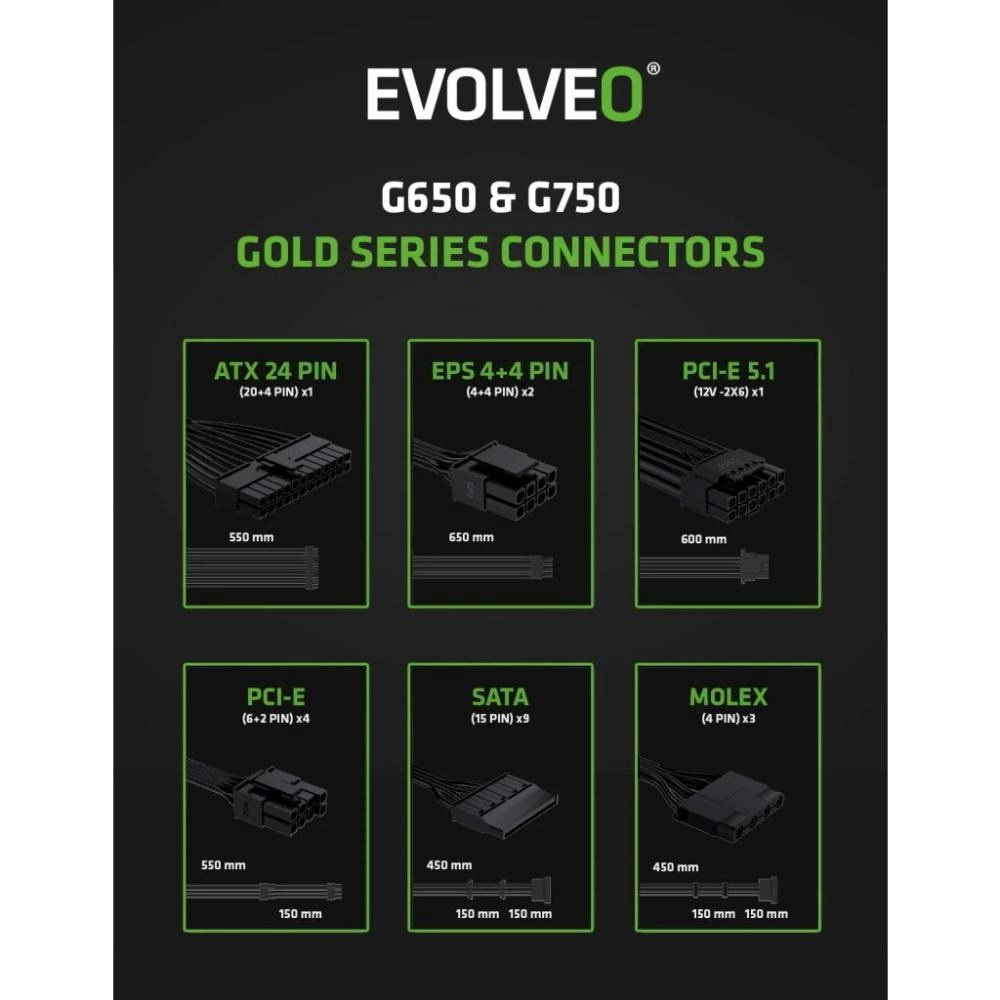 EVOLVEO G850 zdroj 850W, 80+ GOLD, ATX 3.1, aPFC, 140 mm ventilátor