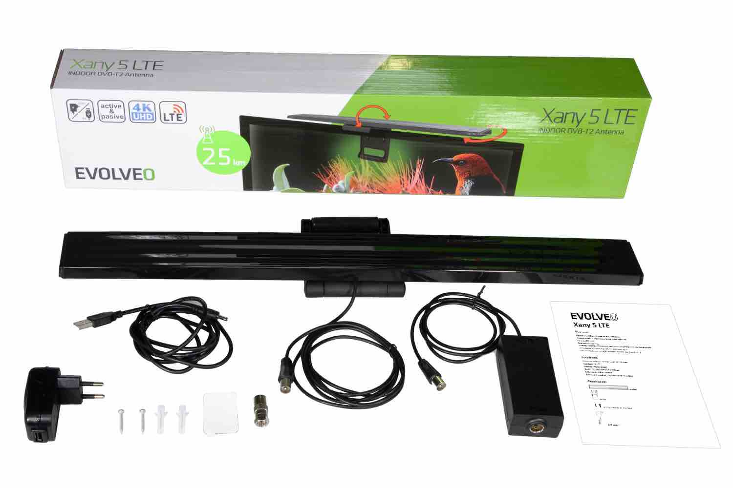 EVOLVEO Xany 5 LTE, 230/5V, aktivní pokojová anténa DAB+/DVB-T2, filtr LTE