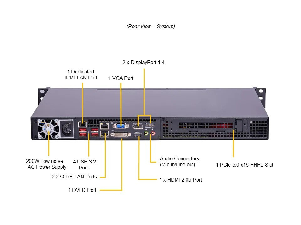 SYS-111AD-HN2-02-G1 CPU: Core i7-12700E Memory: 1x 32GB DDR5-4800 Storage: 1x 1.9TB 2.5" SATA Network: 2x 1G RJ45 1U short-depth front I/O, 2 hot-swap 2.5" SATA drives, 1x PCIe 5.0 x16 (HHHL).