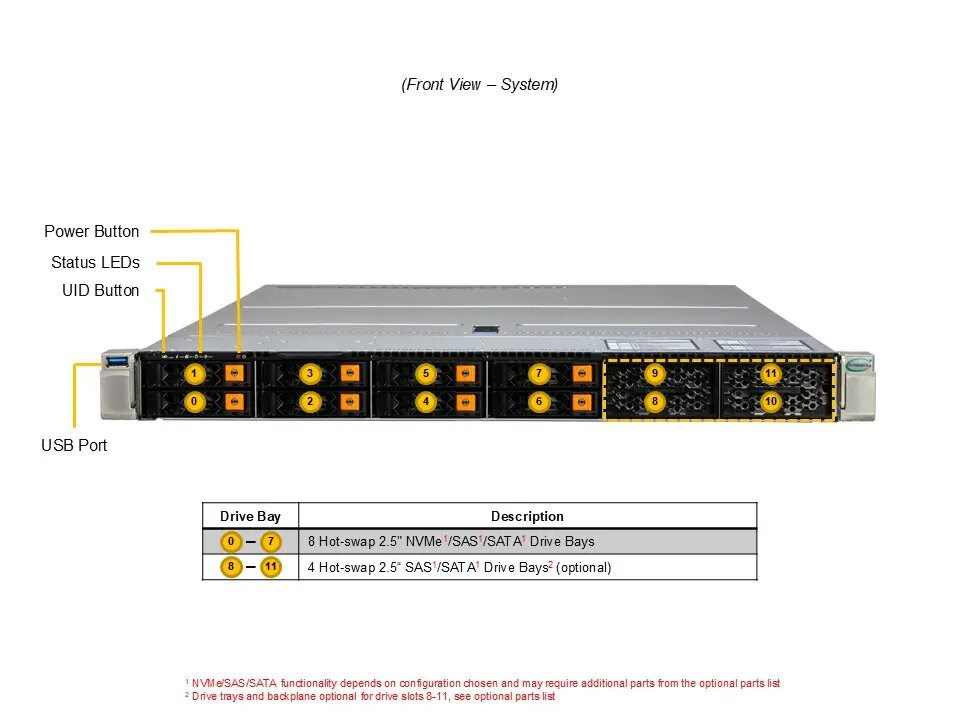 Supermicro AS-1115HS-TNR je vysoce výkonný 1U server navržený pro moderní datová centra. Tento server podporuje procesory AMD EPYC™ 9004/9005* Series a až 12 DDR5 DIMM slotů, což zajišťuje vynikající výpočetní výkon a paměťovou kapacitu. S jedním U.2 NVMe SSD a flexibilními síťovými možnostmi je ideální pro širokou škálu aplikací, včetně virtualizace a cloud computingu.