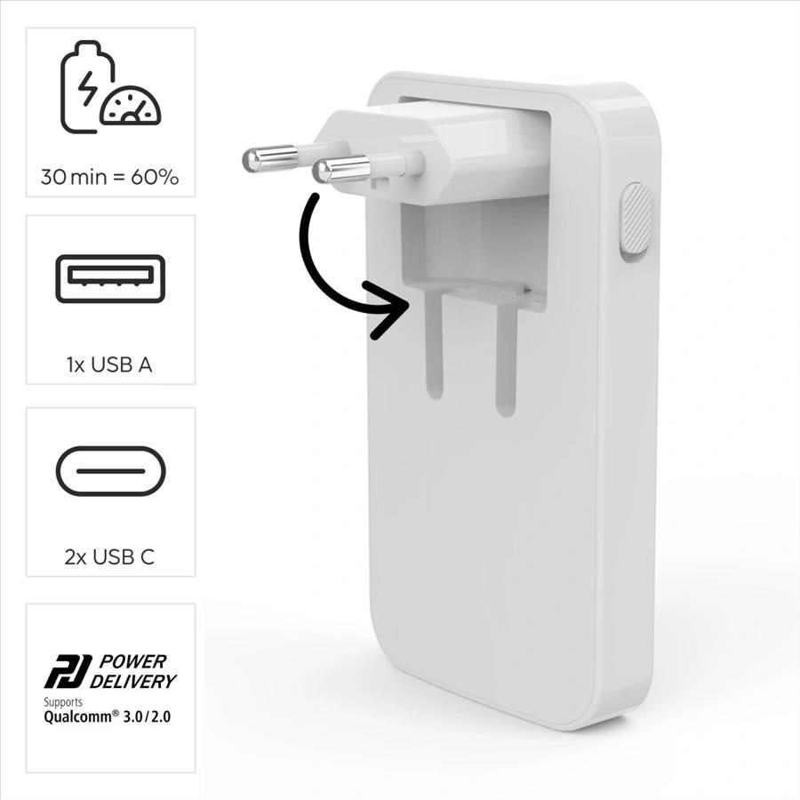 - inovativní konstrukce s velmi plochým tělem a sklopnou euro vidlicí, nabíječka se snadno vejde i do plochých kapes/přihrádek