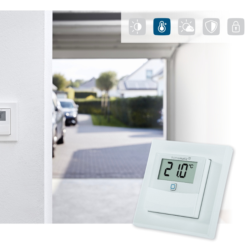Bezdrátový nástěnný Senzor teploty a vlhkosti (HmIP-STHD) s LED displejem o velikosti 1,74" (4,4 cm) pro zobrazení aktuálních informací představuje inteligentní způsob pro regulaci vytápění a úsporu energií.
