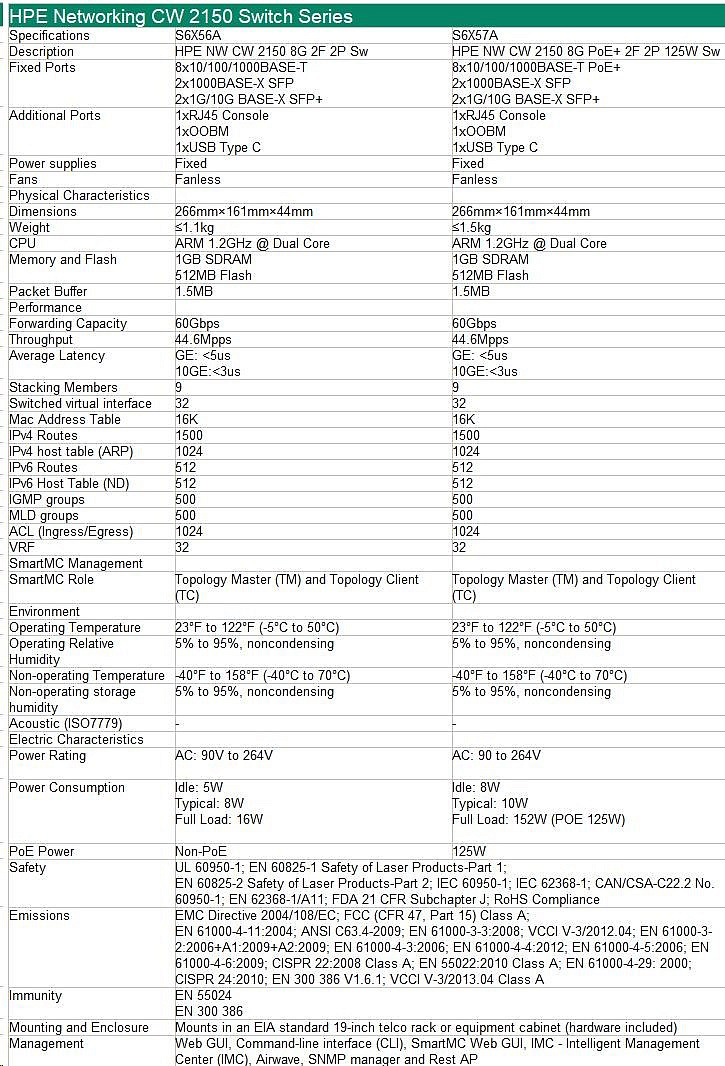 HPE Networking CW 2150 8p 10M/100M/1G 2p SFP 1G 2p SFP+ 1G/10G Switch.