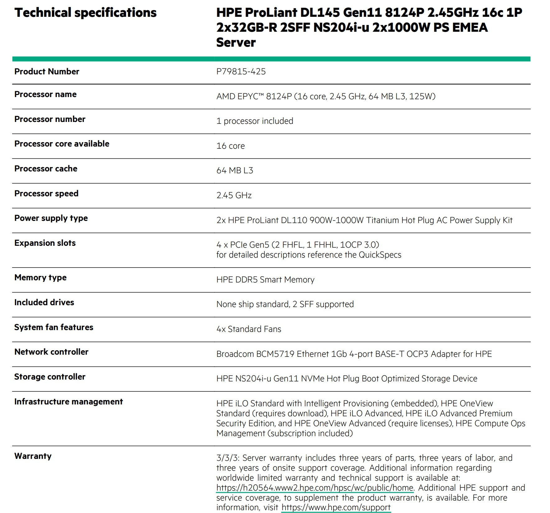 | Technical specifications | HPE ProLiant DL145 Gen11 8124P 2.45GHz 16c 1P2x32GB-R 2SFF NS204i-u 2x1000W PS EMEAServer |