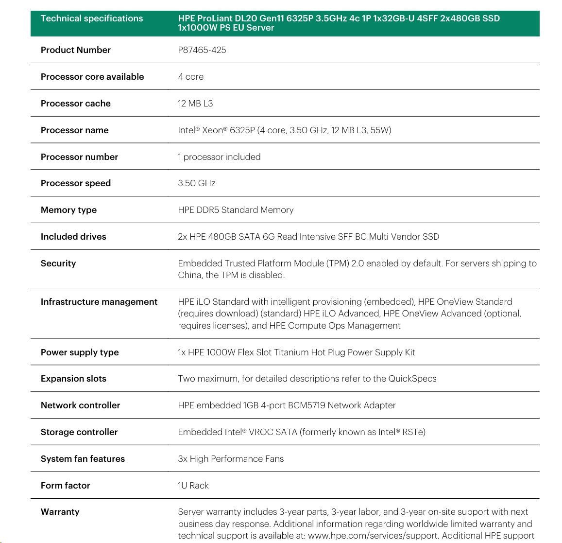 HPE PL DL20g11 6325P (3.5G/4C8T) 1x32G 2x480G SSD VROC 4SFF-HP 4p1Gb 1x1000W Smart Choice.
