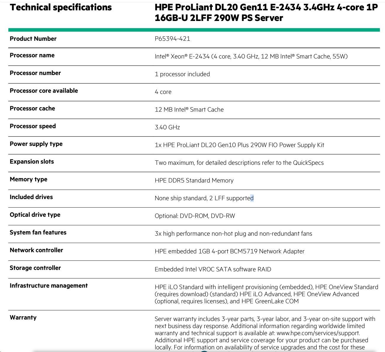 HPE PL DL20g11 E-2434 (3.4G/4C) 16G (P64336) 2LFF-HP 290W 4p1G