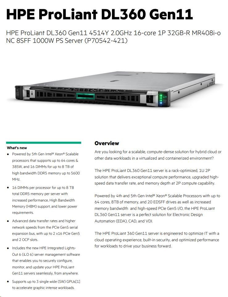 | Model Name | HPE ProLiant DL360 Gen11 4514Y 2.0GHz 16-core 1P 32GB-R MR408i-o NC 8SFF 1000W PS Server |