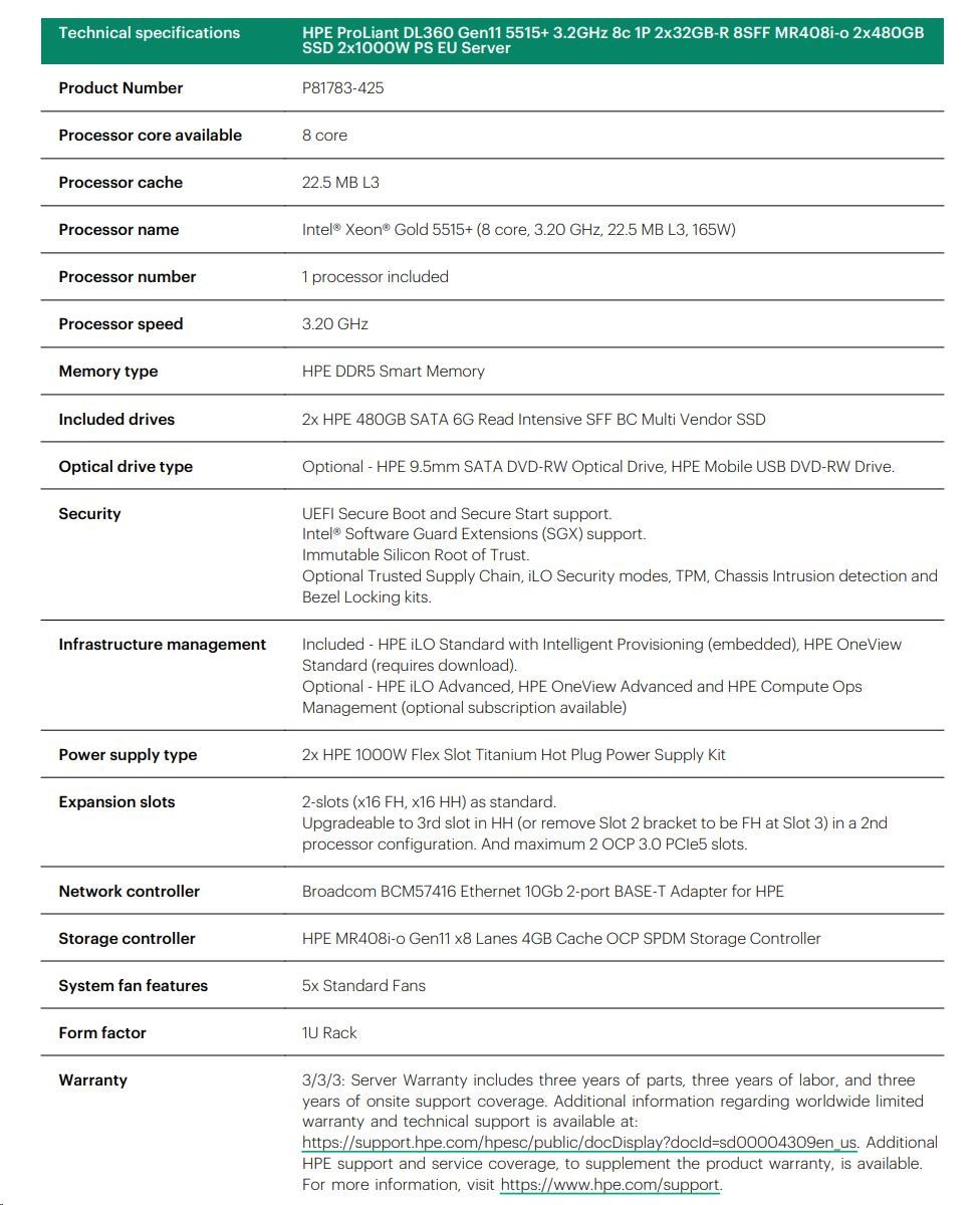 HPE PL DL360g11 5515+ (3.2G/8C) 2x32G (P64706) 2x480G 8SFF MR408i-o/4G 2x1000W 2x10G-T