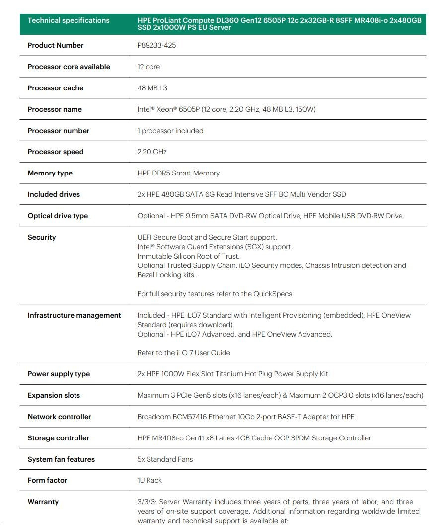 HPE PL DL360g12 6505P (2.2G/12C) 2x32G (P69727) 2x2.4TB MR408i-o 8SFF 2x1000W 2p10GbE NBD333 Smart Choice.