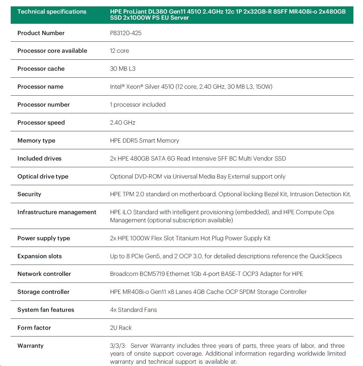 HPE PL DL380g11 4510 (2.4/12C) 2x32G (p64706) 2x480G 8SFF MR408i-o 2x1000W 4p1To Smart Choice.