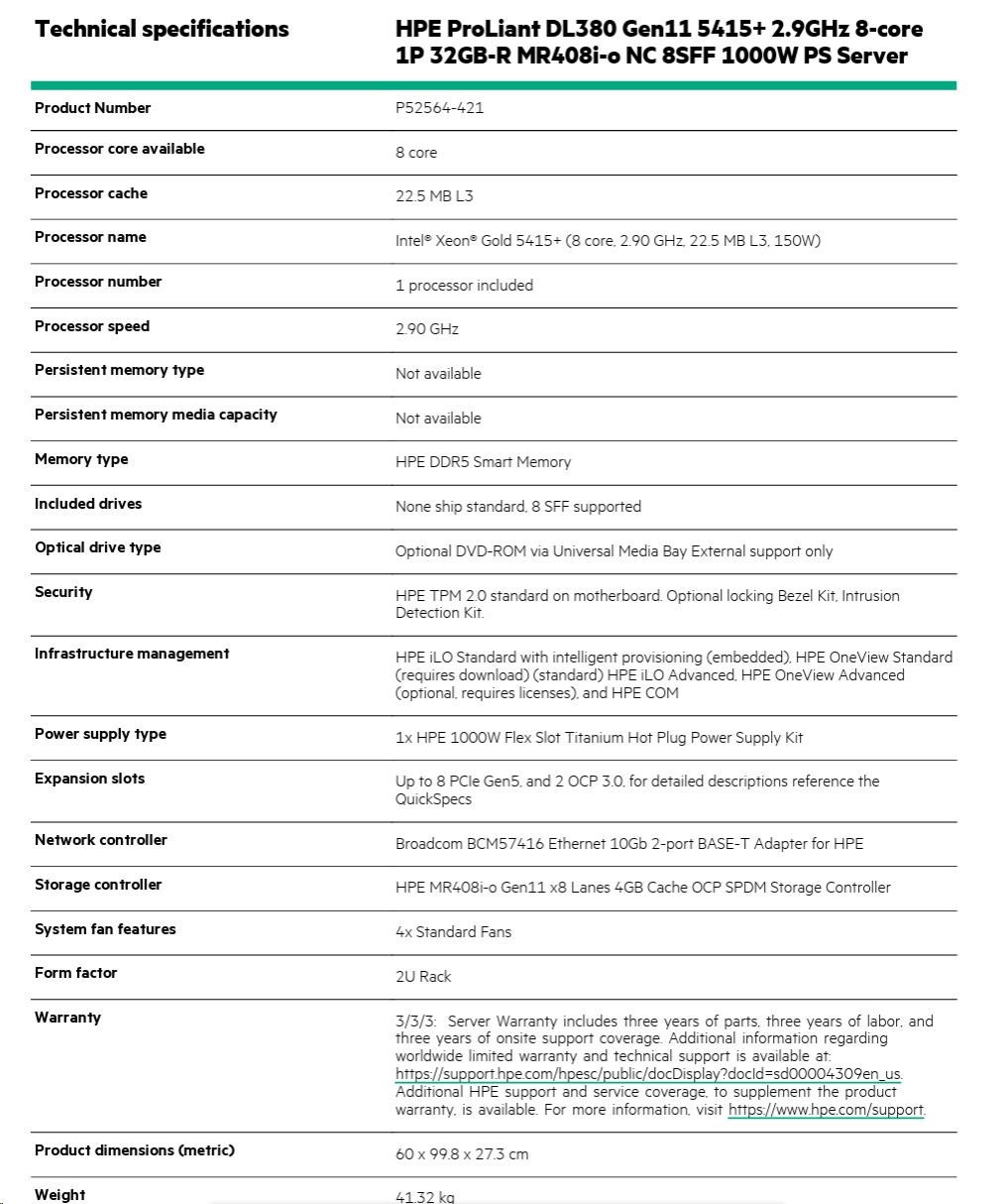 Model Name HPE PL DL380g11 5415+ (2.9/8C/23M/4400) 32G MR408i-o/4G 8-26SFF 1000Wtit 2x10G iLO6 base-T 2U NBD333