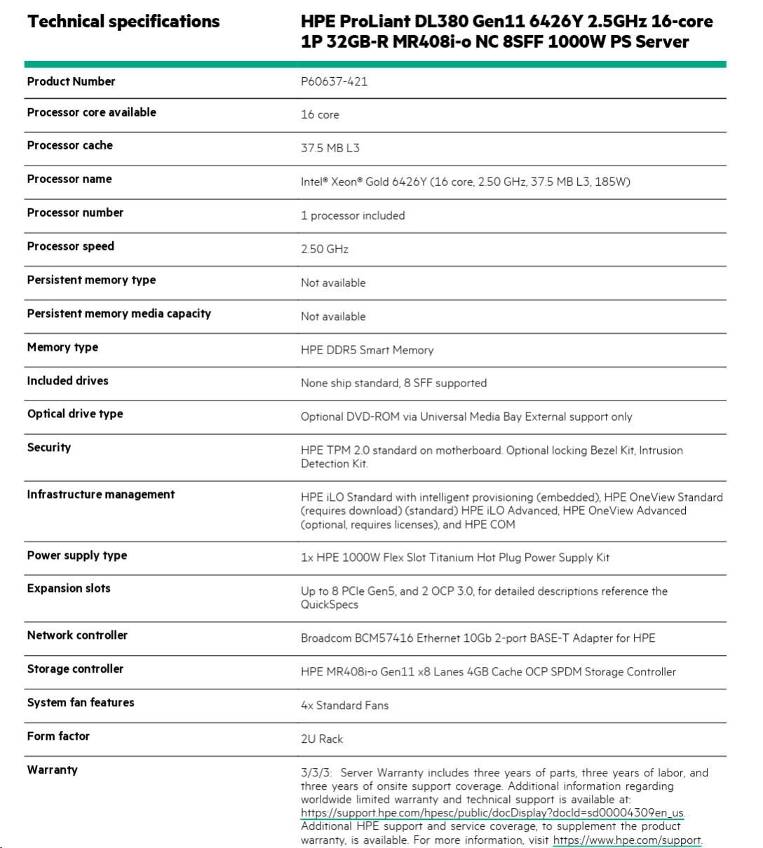 Model Name HPE PL DL380g11 6426Y (2.5/16C/38M/4800) 32G MR408i-o/4G 8-26SFF 1000Wtit 2x10G iLO6 base-T 2U NBD333