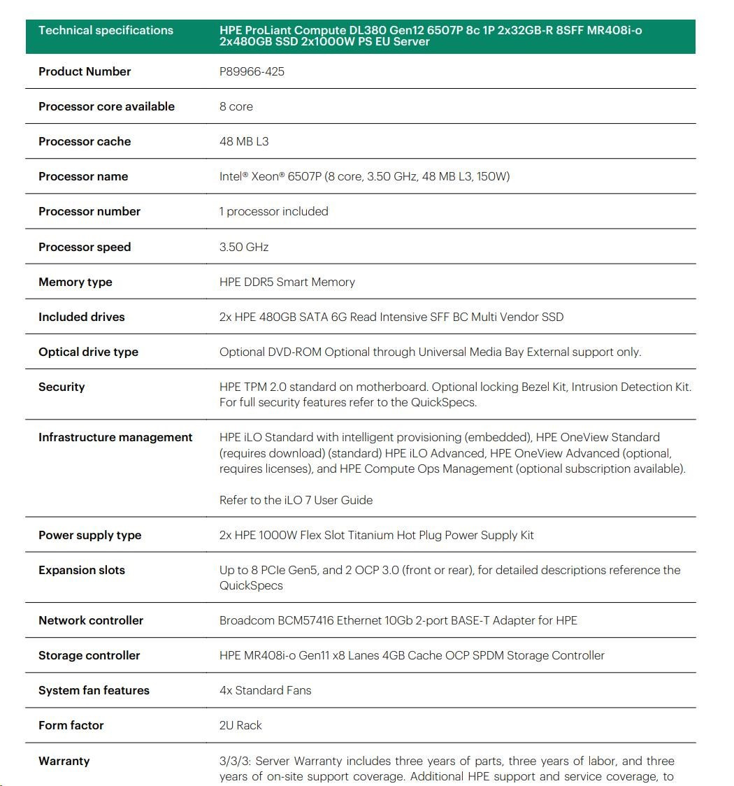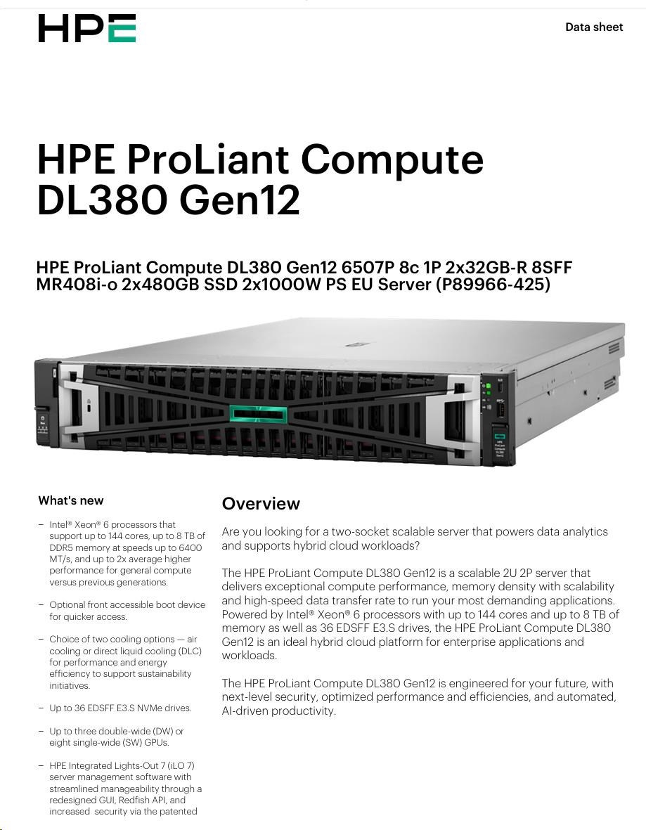 HPE PL DL380 Gen12 6505P (2.2/12C) 2x32G (P69727) 2x480G MR408i-o 8SFF 2x1000W 10GbE NBD333 Smart Choice.