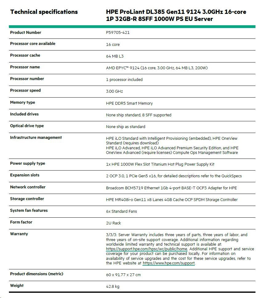 HPE PL DL385g11 AMD Epyc 9124 (3.0G/16C) 1x32G MR408i-o/4G 8-34SFF(3x8F+8M+2R) 1x1000W L9 4x1Gocp P59705-421 RENEW