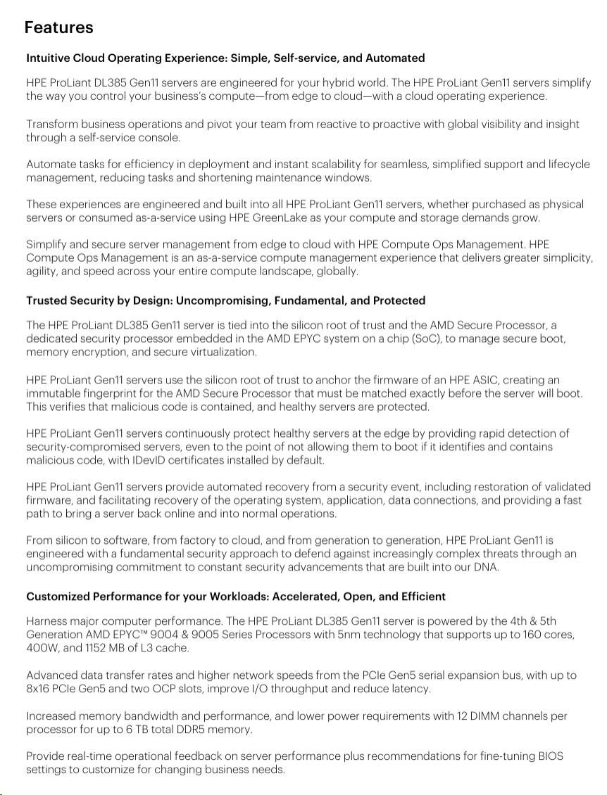 Technical specifications HPE ProLiant DL385 Gen11 9015 2.6GHz 8c 1P 2x32GB-R 8LFF HPE MR408i-o 2p10Tocp 2x1000W PS EU