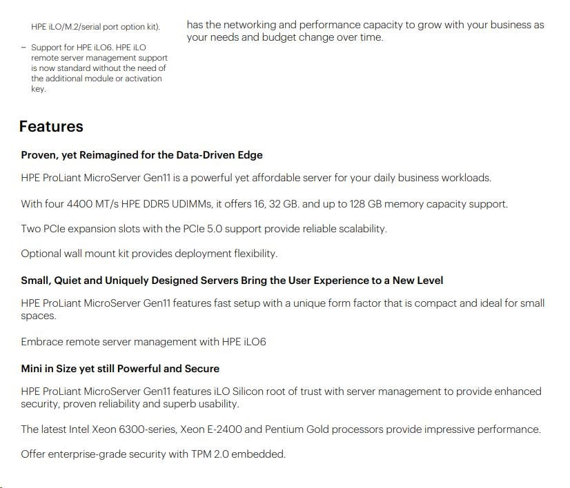 HPE ProLiant MicroServer Gen11 poskytuje cenově dostupný kompaktní, ale výkonný server základní úrovně, který si můžete přizpůsobit pro místní, okrajové, hybridní cloudy nebo dokonce pracovní zátěže náročné na výkon datového centra. Má ultra mini věžový tvarový faktor a lze jej umístit naplocho nebo svisle nebo namontovat na stěnu v závislosti na prostředí zákazníka. Nejnovější podporované procesory Intel Xeon® E a Pentium® dodávají serveru výpočetní výkon, zabezpečení a vzdálenou správu s křemíkovým kořenem důvěry HPE iLO. Spolu s dalšími vylepšeními, jako jsou 4 sloty DIMM pro paměti DDR5 a 2 sloty PCIe, ať už chcete server pro všeobecné použití, NAS nebo dokonce virtualizační server, budete překvapeni, kolik toho můžete z tohoto malého a cenově dostupného serveru vytěžit.