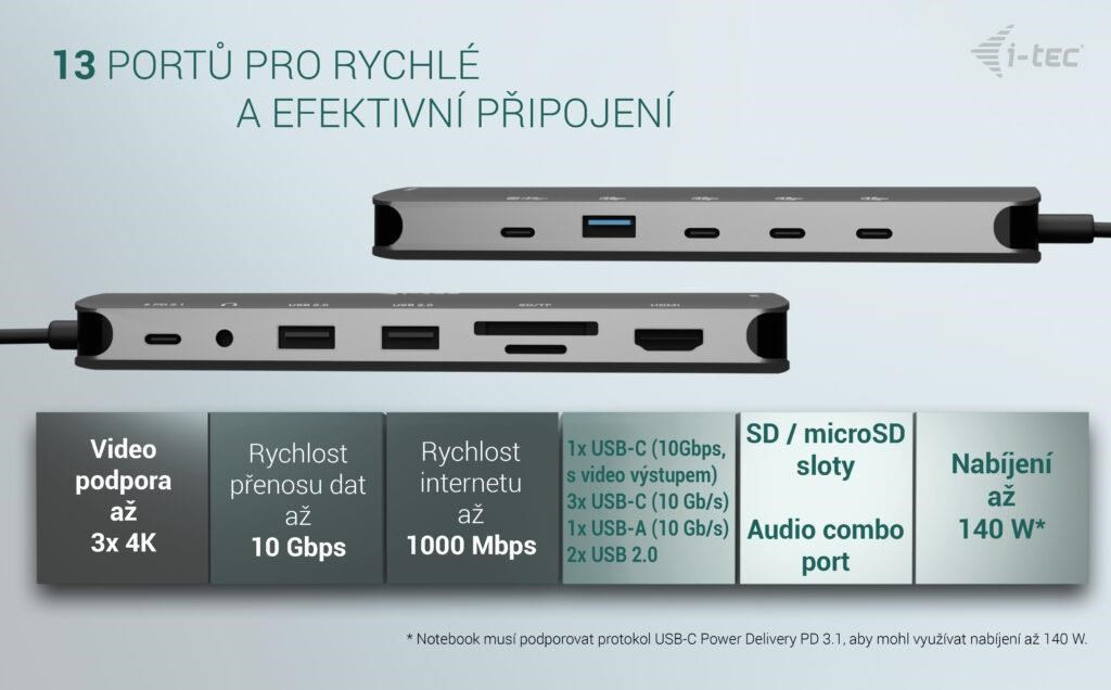 ** Pokud váš notebook nebo tablet podporuje nový a moderní nabíjecí protokol USB-C Power Delivery PD 3.1, dokovací stanice nabídne nabíjecí výkon až 140 W (pokud máte protokol PD 3.0, nabíjecí výkon bude až 100 W).