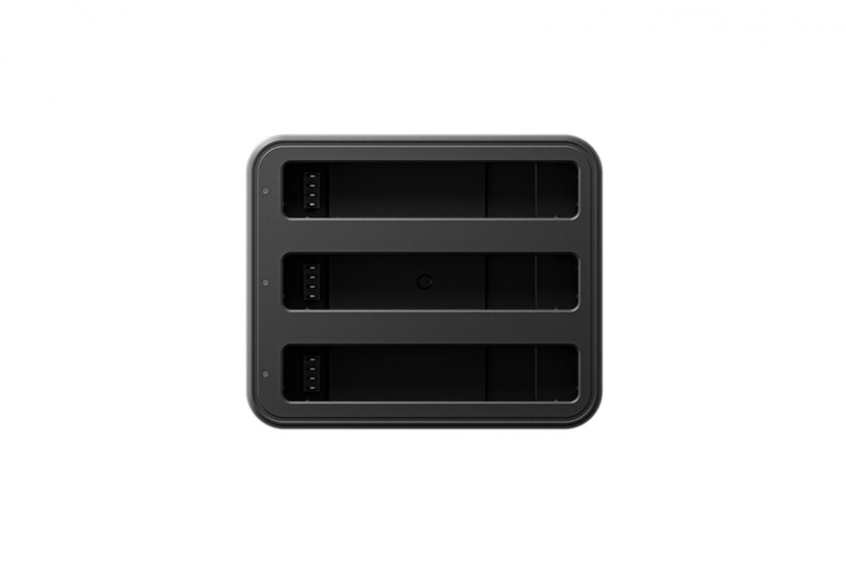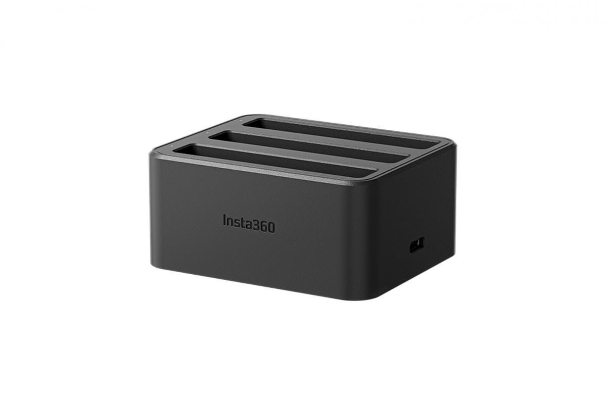 Nabíjecí hub pro tři baterie pro kameru Insta360 X4. Hub nabije 2290 mAh akumulátor za 43 minut (za 26 minut na 80%). Váha: 109g Rozměry: 75 x 62 x 34 mm.