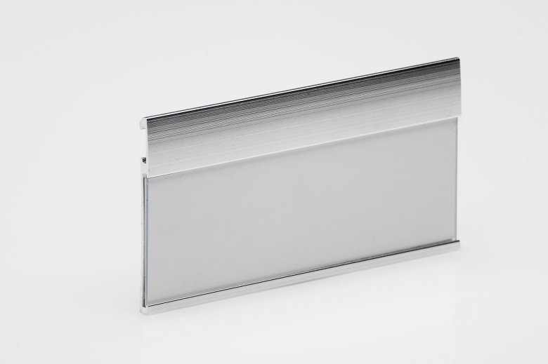 Luxusní kovová jmenovka o rozměru 80×42 mm. Vnitřní rozměr 80×27 mm. Provedení z hliníku s matovou povrchovou úpravou. Část jmenovky určená k popisu je chráněna čirým tuhým plastem, potaženým snímatelnou fólií. Možnost uchycení na oděv pomocí špendlíku nebo speciálních plastových úchytek..