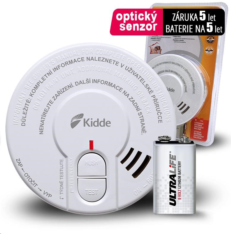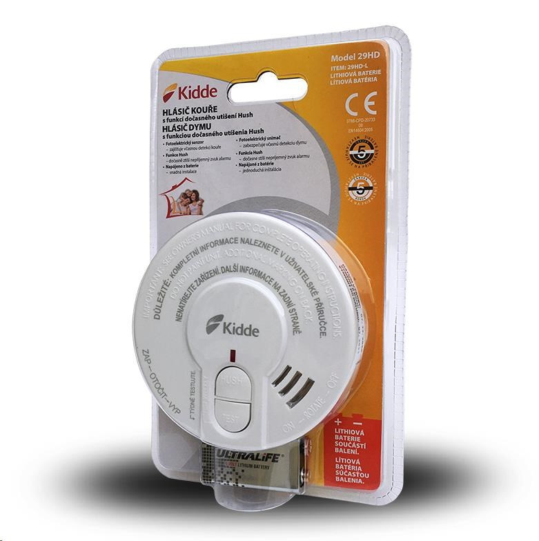 Hlásič požáru je vybaven testovacím tlačítkem TEST pro kontrolu správného fungování zařízení a HUSH pro přechodné umlčení požárního hlásiče pro případ planého alarmu. Stisknutí tlačítka způsobí okamžitou deaktivaci alarmu, na dobu asi 10minut, snížení citlivosti obvodů a vypnutí akustické signalizace hlásiče. Tlačítko HUSH používejte pouze tehdy, pakliže znáte příčinu aktivace hlásiče (např. při vaření nebo smažení). Po cca 10 minutách od deaktivace hlásiče se tento zcela automaticky resetuje do původního nastavení pro monitorování nebezpečí požáru. Pokud v místnosti zůstane vysoká koncentrace kouře, můžete stisknout tlačítko HUSH opakovaně a to až do okamžiku kdy je místnost řádně odvětrána. Tento model je vybaven nejmodernějším fotoelektrickým senzorem Kidde.