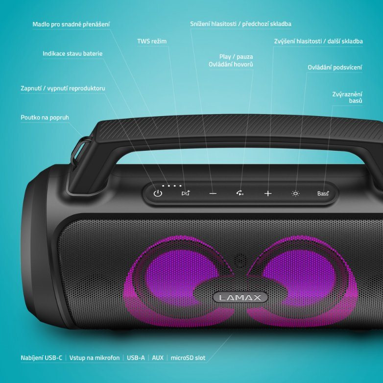 Přenosný Bluetooth party reproduktor s madlem, BT 5.3, výkon 100 W, 3 režimy LED podsvícení, 20 hodin výdrž, ovládání přes zařízení s iOS nebo Android, drátový mikrofon v balení, LAMAX BeatBass®, voděodolnost IP67, 6,3 mm jack, SD karta, USB-A vstup, funkce powerbanky, TWS funkce pro připojení druhého reproduktoru..