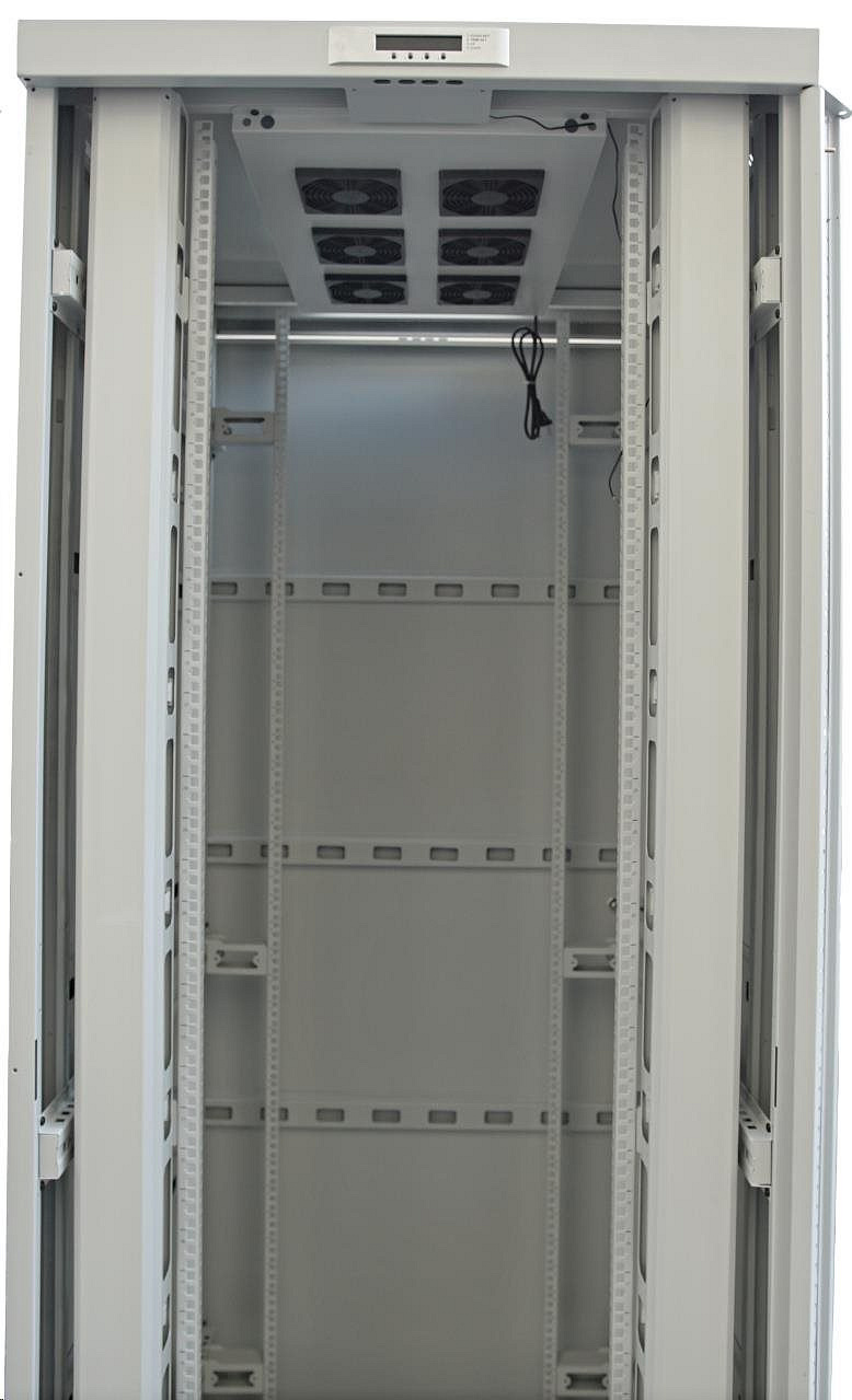 LEXI-Net 19" stojanový rozvaděč 45U 800x800 rozebiratelný, ventilace, termostat, kolečka, 600kg, sklo, rozložený, šedý
