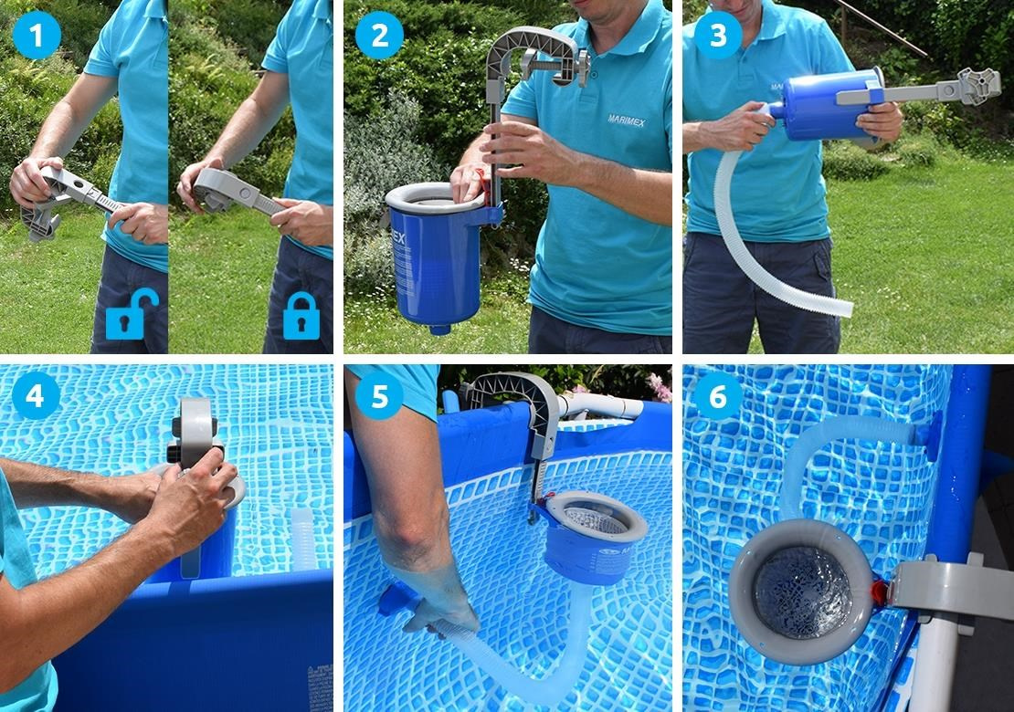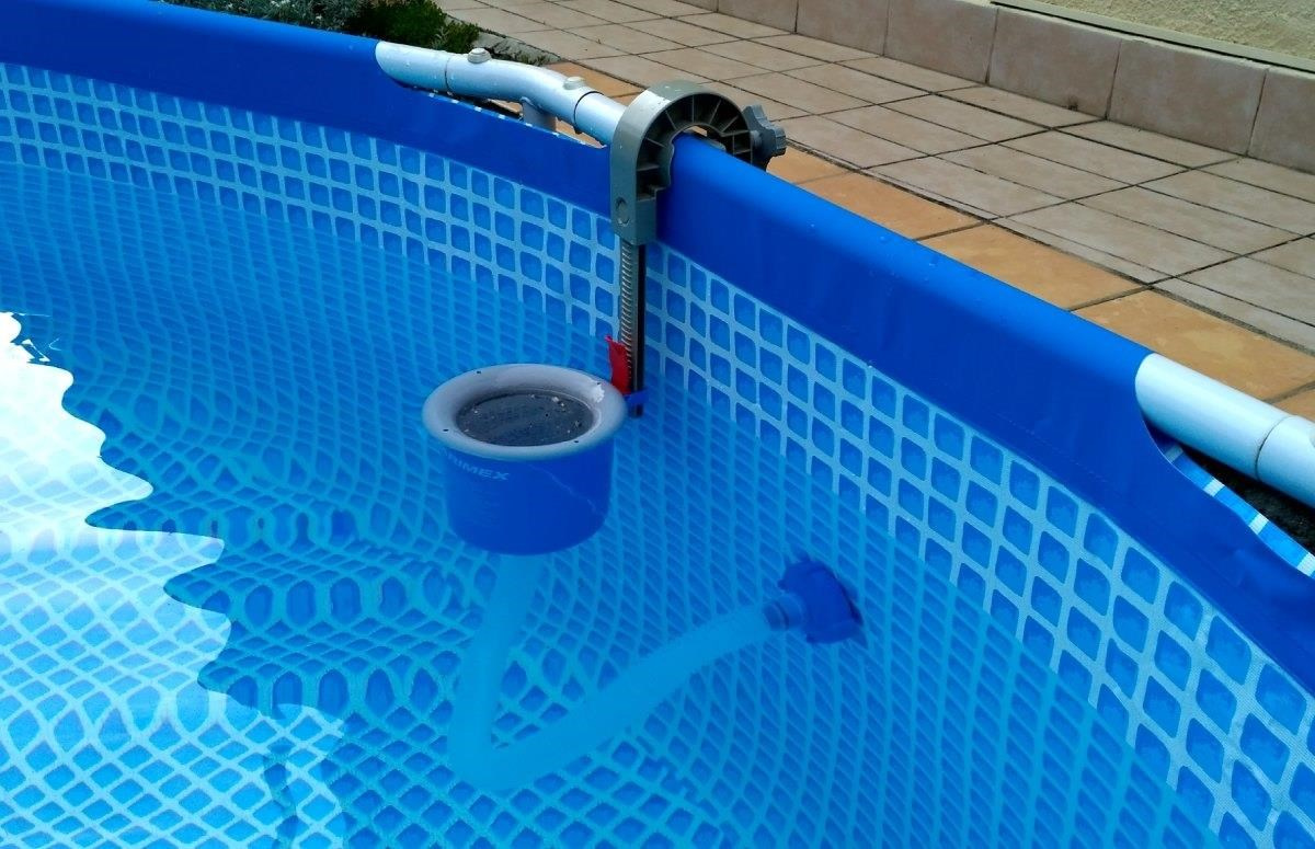 Marimex skimmer závěsný univerzální je sběrač hladinových nečistot pro všechny nadzemní bazény, vhodný pro bazény s nafukovacím prstencem i kovovou konstrukcí, součástí košík pro vkládání chlorových tablet a 5/4 hadice k propojení skimmeru a průchodu stěnou.
