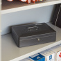 Pokladní uzamykatelný box CB-12ML slouží pro uložení hotovosti a má pevnou ocelovou konstrukci. Vyjímatelný tác s 8-mi přihrádkami pro mince, praktické držadlo a 2ks klíčů jsou součástí balení..