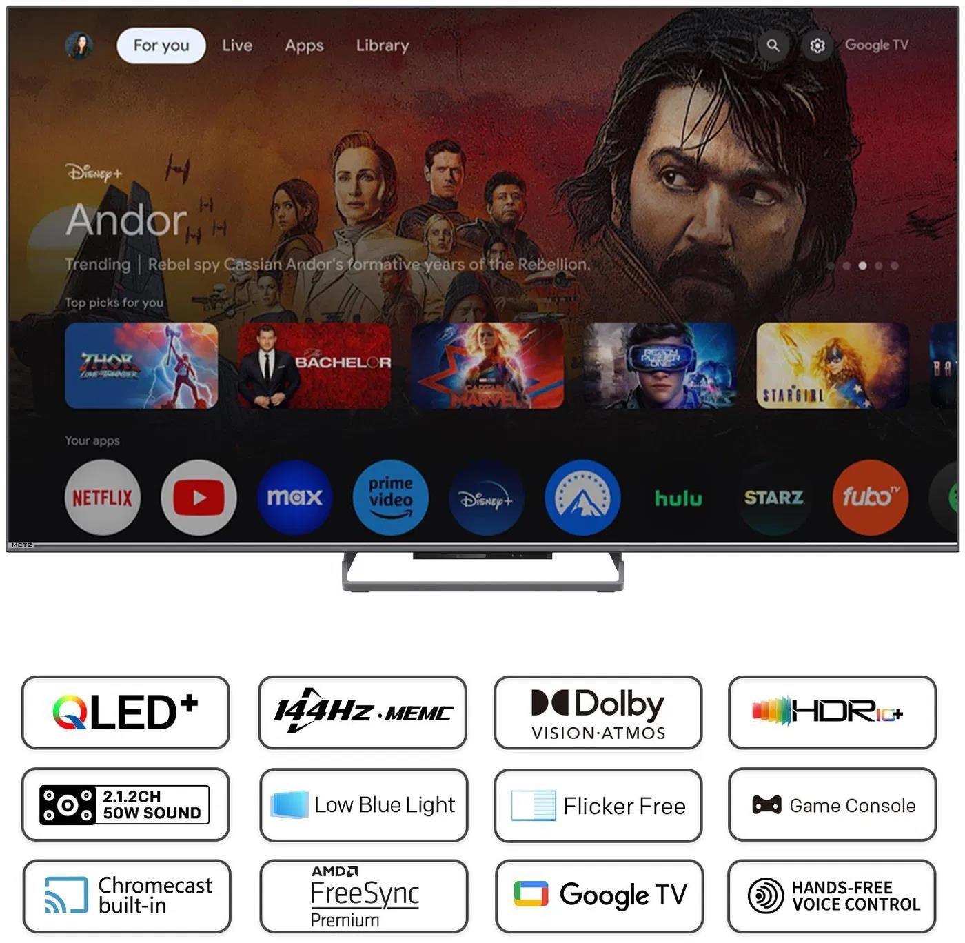Google TV, QLED, 165cm, 4K Ultra HD, 100/120 Hz (144 Hz – herní režim), HDR10+, Dolby Vision, DVB-T2/S2/C, 3× HDMI, 2× USB, CI+, LAN, Bluetooth, Chromecast, herní režim, hlasové ovládaní, Google Assistant, párování s mobilním zařízením, Oneplay, VESA 400×200, Dolby Atmos, energetická třída F. Evropská distribuce..