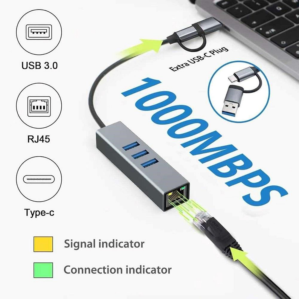 Převodník, který umožní připojit Váš počítač s portem USB typu C do internetu nebo k lokální síti pomocí kabelu s RJ45 a navíc umožňuje zapojit tři USB3.2 periferie jako USB disk, tiskárnu, klávesnici a myš
