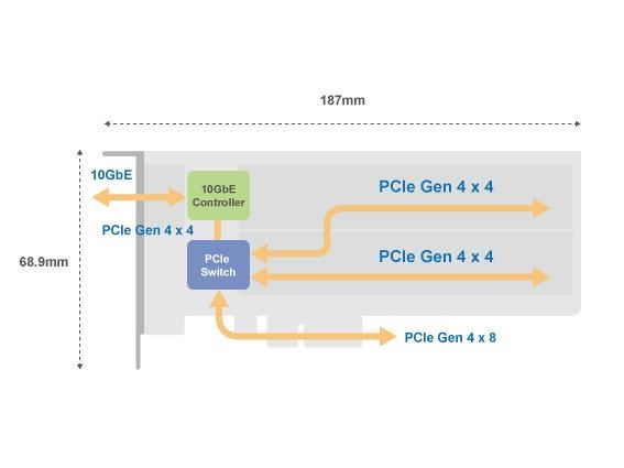 PCIe Gen4 rozšiřující karta s 2x M.2 NVMe SSD sloty a 1x 10GbE portem
