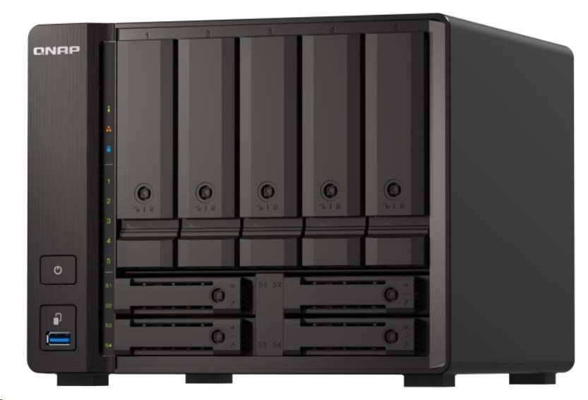 | Pozice pro diskové jednotky | 5 x 3,5" + 4 x 2,5" Systém se dodává bez HDD/SSD. Seznam kompatibilních disků HDD/SSD najdete na stránce https://www.qnap.com/compatibility/ |