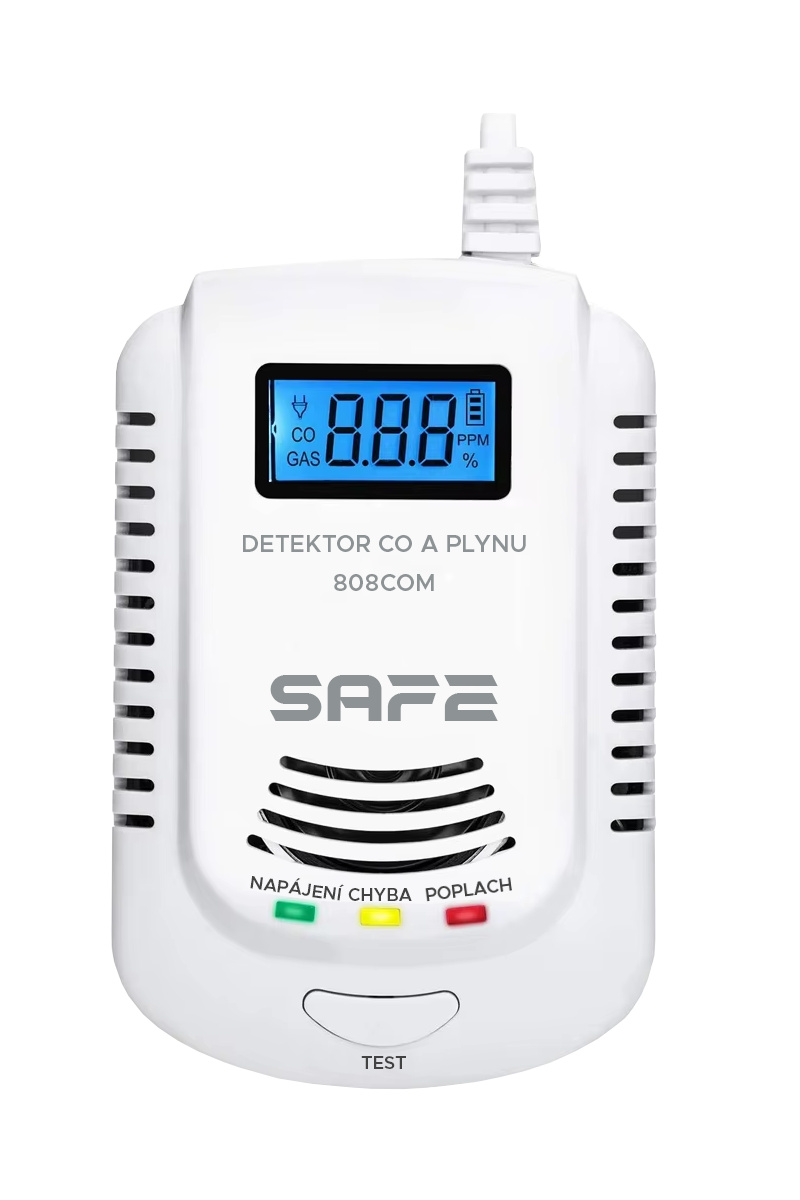 Kombinovaný detektor hořlavých a výbušných plynů SAFE-808COM s bateriovým zálohováním, digitálním displejem, pamětí posledního poplachu a unikátní funkcí hlasového varování v českém jazyce. Detektor hořlavých plynů - měřící zařízení - Model SAFE 808COM.Tento výrobek je chytrým detektorem s hlasovým varováním určeným k indikaci úniku oxidu uhelnatého a všech běžně se vyskytujících výbušných plynů v domácnostech (zemní plyn, metan, propan, butan) a v obytných prostorách bez významného nebezpečí. Zařízení se ideálně hodí pro detekci plynu ze všech domácích plynových spotřebičů, plynových kotlů a indikuje únik hořlavého plynu používaného k vytápění, vaření či ohřívání.